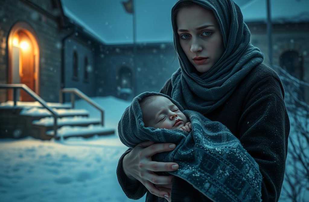 The icy wind howled through the empty streets as frost painted the windows of sleeping houses. Beneath the dim glow of a streetlamp, a woman trudged forward, her arms cradling a small bundle wrapped in a worn wool blanket. The baby, snug beneath a knitted cap, slept soundly against her chest, oblivious to the moment that would tear his life in two.