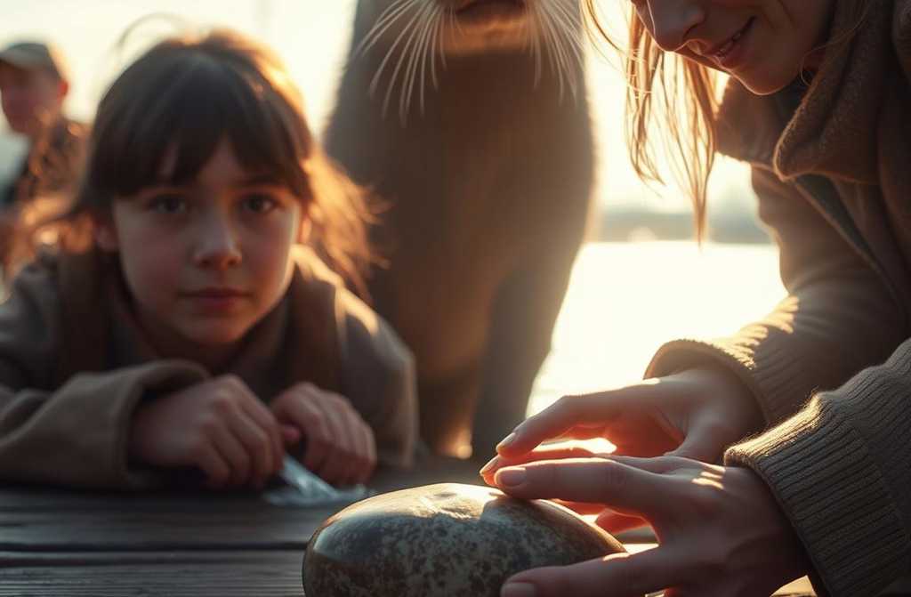 He surfaced near the dock, studying the men. Then, slowly, with effort, he pushed something from beneath his front pawa stone. Grey, smooth, slightly oblong, worn by years of use. He placed it on the wooden plankthe very spot where he had once begged for help.