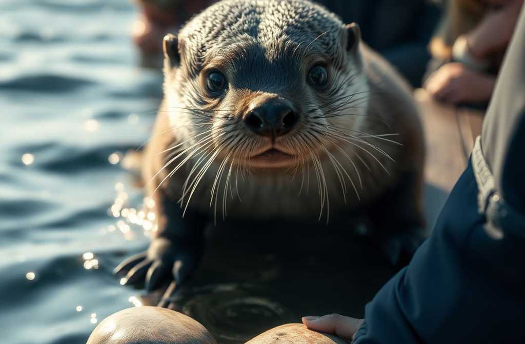 First, they heard the splashsomething wet and swift slipping from the water, scrambling onto the dock. Heads turned. An otter stood there. A male. Dripping, trembling, his eyes wide with fear and desperation. He didnt flee or hide, as wild creatures do. No. He darted between the men, brushed a paw against someones leg, whimpered almost like a child, then dashed back to the waters edge.