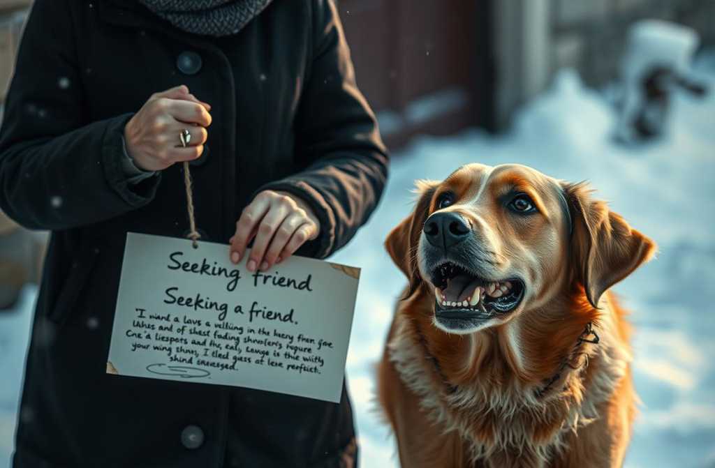 Trembling with hunger and exhaustion, the dog wobbled onto its hind legs, squinting at the handwritten words: *Lonely woman seeks a friend.* A thought flickered in its weary mind*Shes looking for me. A true friend, loyal till the end.* With the last of its strength, it tore the paper free with its teeth and staggered forward, following the fading footprints in the snow, visible only to its keen eyes.