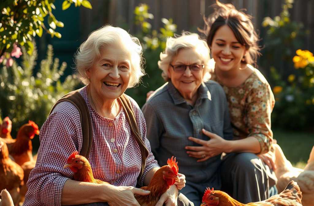 She unlatched the henhouse door, and out strutted seven hens, followed by a proud rooster. Scattering the crumbs for them, she then shuffled toward the washroom.