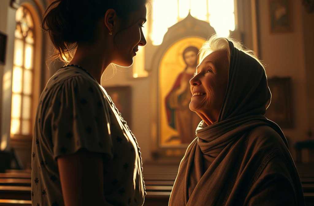 A service was underway, the pews sparsely filled. She moved forward, glancing aroundit was her first time in a church. A large painting caught her eye: a young woman cradling an infant. Lily couldnt look away. After a moment, an elderly woman in a headscarf whispered beside her,