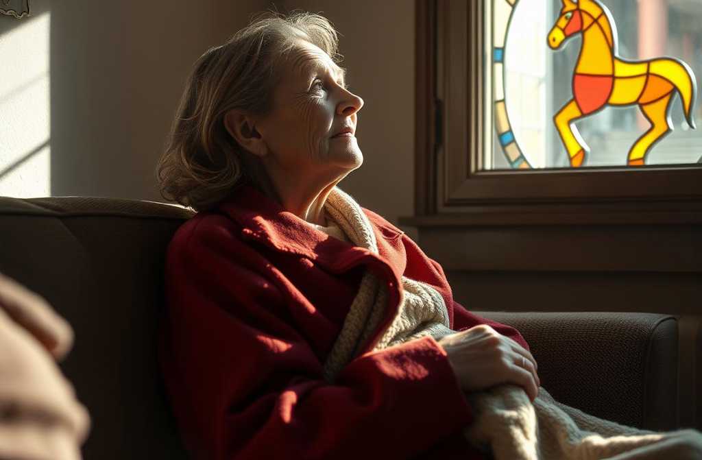 One evening, passing a shop window, she saw a small stained-glass horsevibrant, delicate.