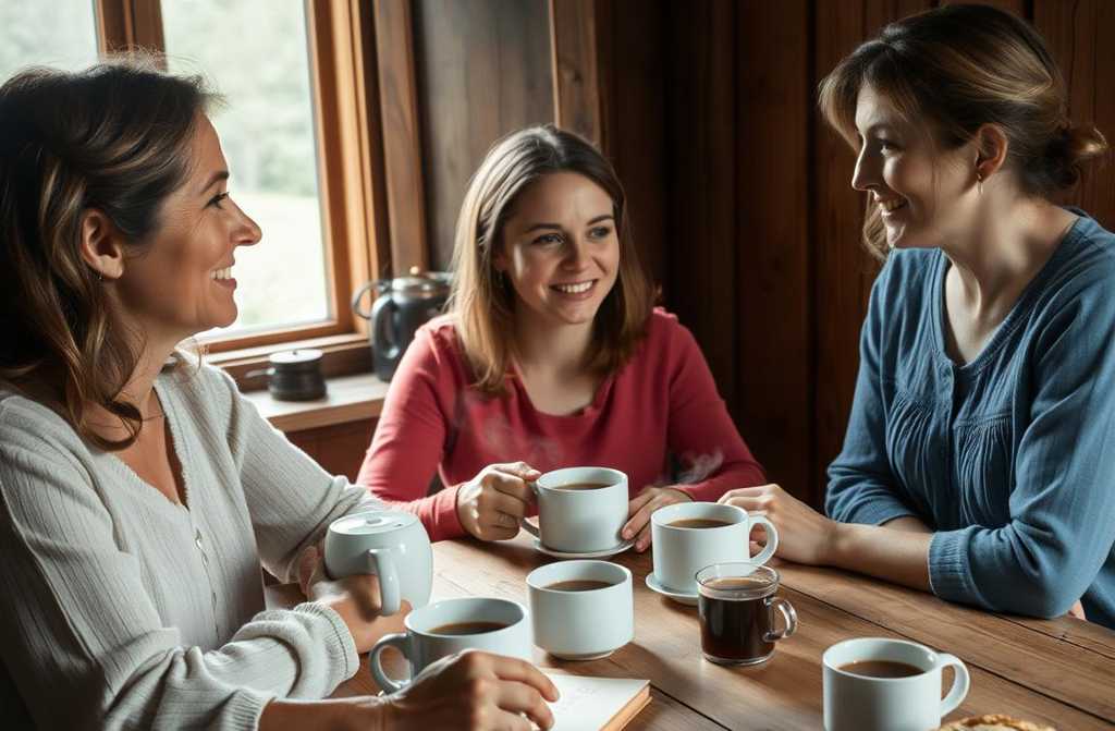 The kitchen is cool; the vent remains open after the storm. The sisters gather at the table: someone puts a kettle on the hob, another finds a packet of biscuits in the cupboard.