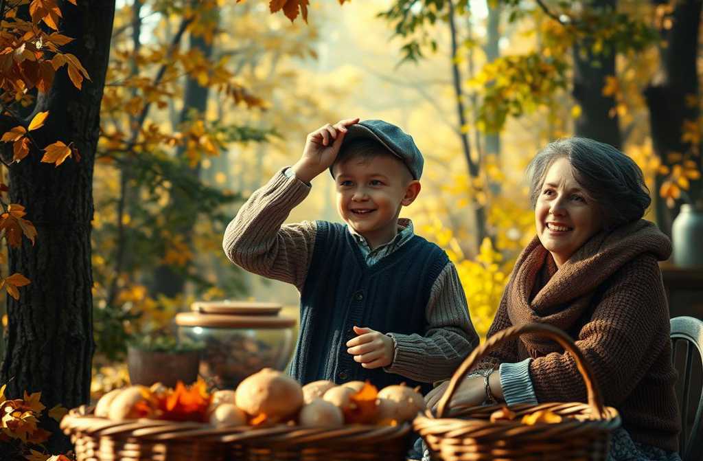 Кухня была тёплой от плиты; стекло окна запотело тонкими полосами, видны были лишь мерцающие огоньки фонаря во дворе и силуэты деревьев за изгородью. Ваня сидел ближе к столу, рядом бабушка ловко сортировала грибы: подберёзовики в одну кучу, лисички в другую, а дед доставал складной ножик для кропотливой работы с опятами.