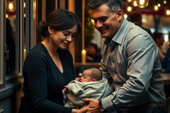 She knelt beside his pavement table, as quiet as a whisper, the newborn cradled against her chest.