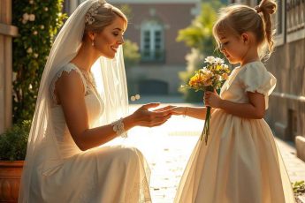 At the wedding, a little girl approached with a bouquet of daisies and asked for a coin the bride noticed