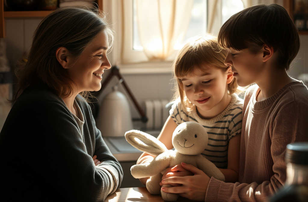 On the threshold stood Ethel in a coat, cheeks rosy, the children behind her. The girl clutched the plush rabbit, the boy a jar of jam.