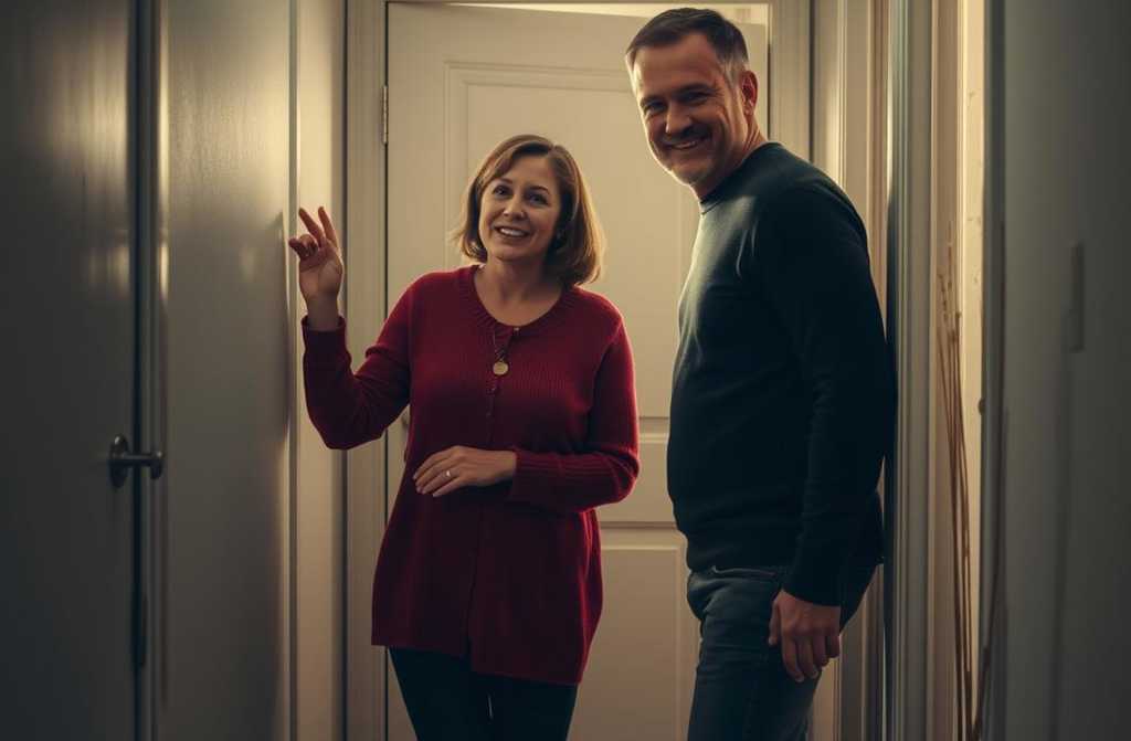 She acts quickly and opens the door. The woman in the hallway straightens up, smooths her hair nervously, and begins to speak.
