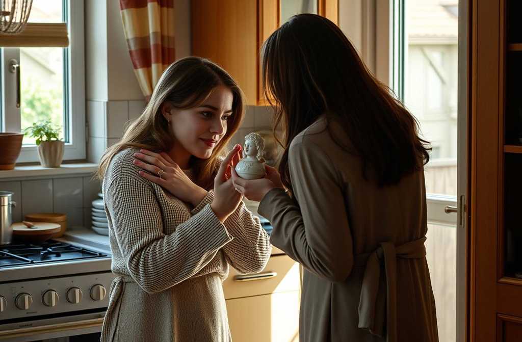 I open the box to find a delicate porcelain figurine of two women holding hands, tied with a ribbon. A note reads, True friendship survives trials. I hope ours does. With love, Sue.