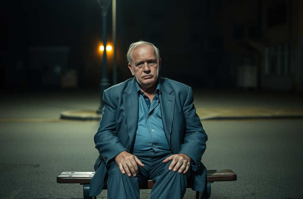 Поздно ночью, возвращаясь домой, Алёна замечает Савелия на скамейке перед подъездом под тусклым фонарём. Он сидит, согнувшись, уже пьяный, глаза мутные, руки на коленях. Алёна почти не узнаёт его.