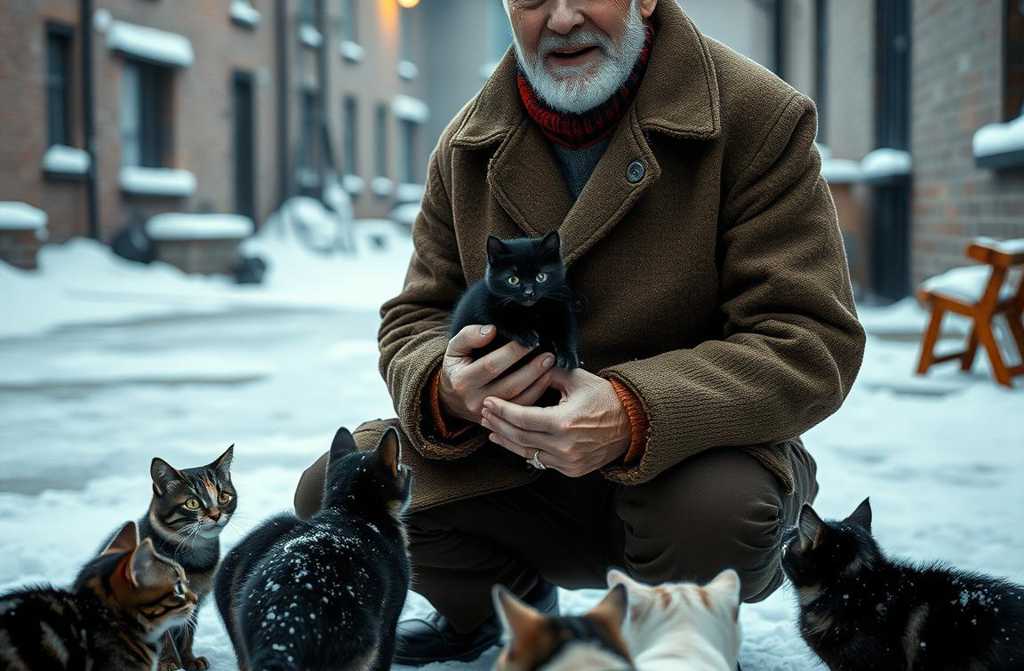 The cats, sensing the storm, retreated to their shelter, realizing no food would come from him today. They huddled together, warm against the cold.