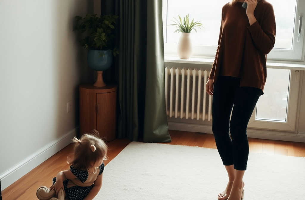 Mum, who were you talking to? Molly peeks out of the nursery, clutching a battered plush rabbit.