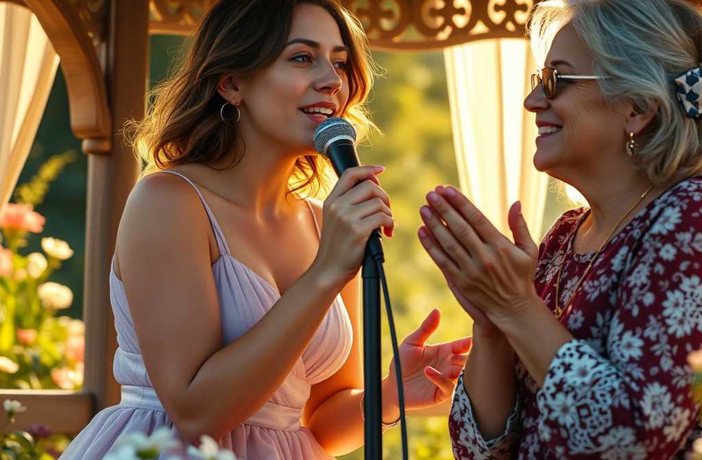 Before she knows it, Emily is onstage, microphone in hand. The opening lines of Ill Never Forget You flash on the screenonce her favourite song. She starts timidly, then each note grows stronger, her voice filling the room. The audience quiets, listening intently. When she finishes, applause erupts.