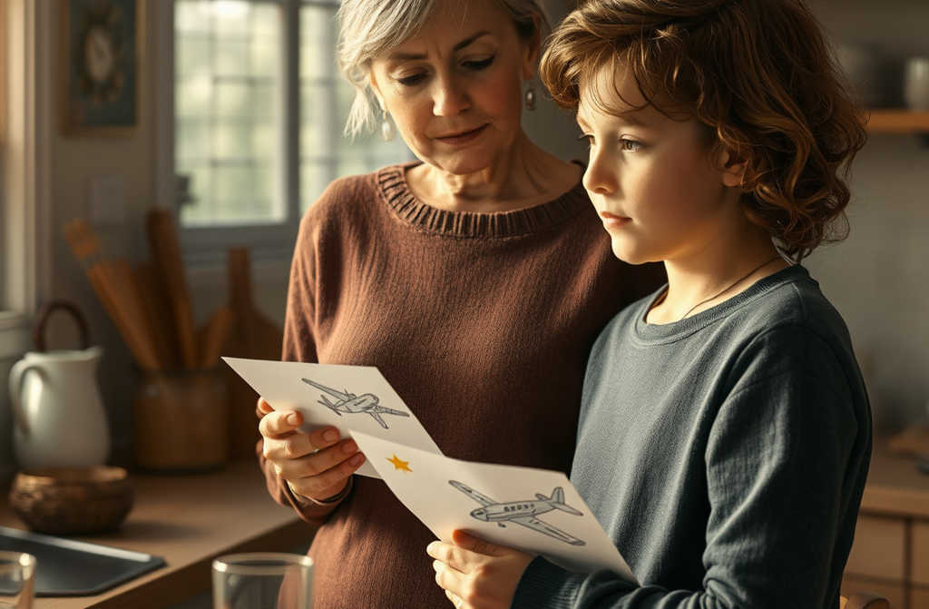 Michael later drew a picture of an airplanelarge, silver, with blue wings and black windows.