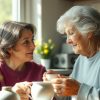 When Andrew walks in, he removes his coat, leans in and kisses her cheek.
