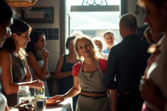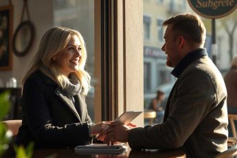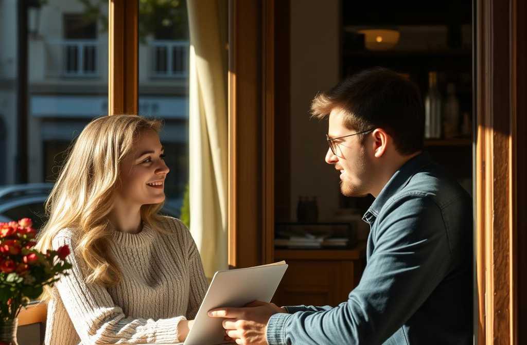 A glamorous blonde sits by the window, typing thoughtfully on a laptop. A waiter places a glass of freshly squeezed juice and a pastry topped with raspberries and strawberries on the table.