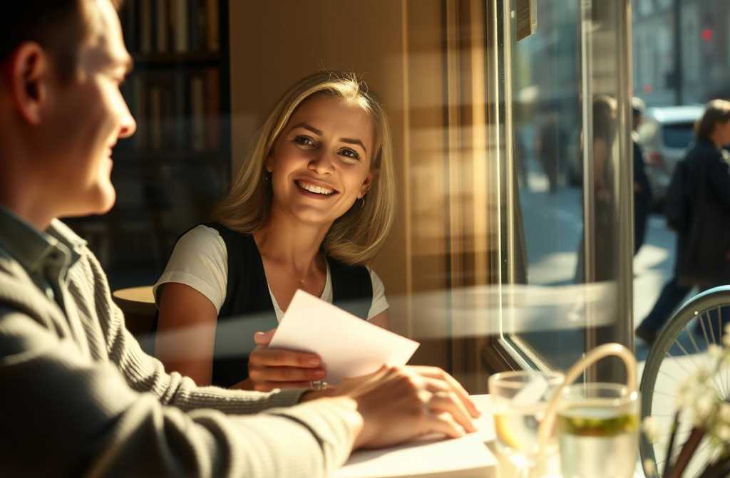 A stylish blonde sits by the window, typing thoughtfully on her laptop. A waiter places a glass of freshly pressed orange juice and a raspberrystrawberry tart before her.