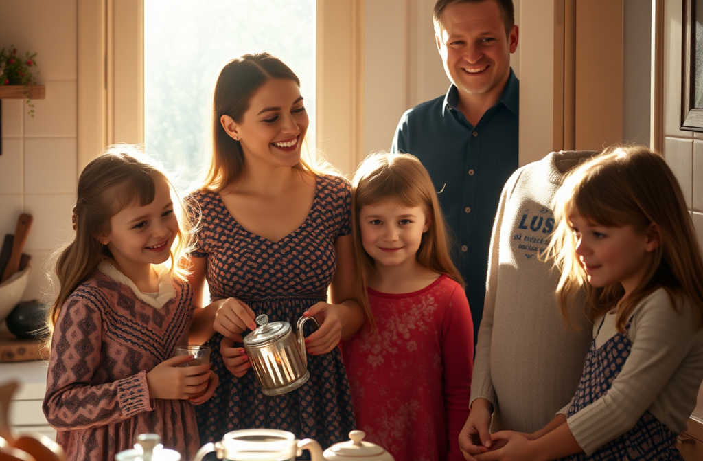 They leave, giggling. In the bathroom, the childrens chatter fades into water splashing. After a few minutes the bedroom door shuts and silence settles. Ten minutes later James returns to the kitchen. Emily still sits at the table, simmering with resentment, her tea still cold.