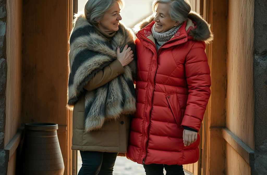 The next morning Valerie walked Gwen to the bus stop, handing her a parcel of thick bacon slices with a bit of fat and a jar of raspberry jam. Outside, the chill made Valeries old coat feel even more outofdate compared to Gwens sleek down jacket, chic fauxfur hat, and lowheeled boots. Gwen looked polished, lips glossy with red balm, while Valerie was bundled in a faded coat, sturdy felt slippers, and a fluffy shawl.
