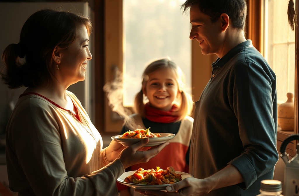 Sam and Lily sat down. Lily stared at the food, then took a bite and brightened.
