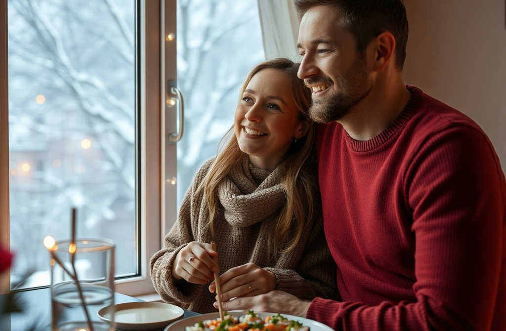 On 31December, as the clock strikes eleven, they sit on the sofa, arms wrapped around each other. Sushi sits on the coffee table, champagne bubbles in crystal flutes, and the classic film Home Alone plays on the telly.