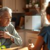 I heat it up, set the table. She arrives on time but fidgety.