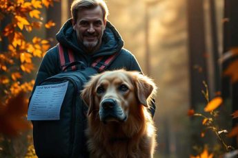 **Дневниковая запись** Измученный пёс выбрался из леса, волоча за собой рюкзак. Его вид встревожил полицию.
